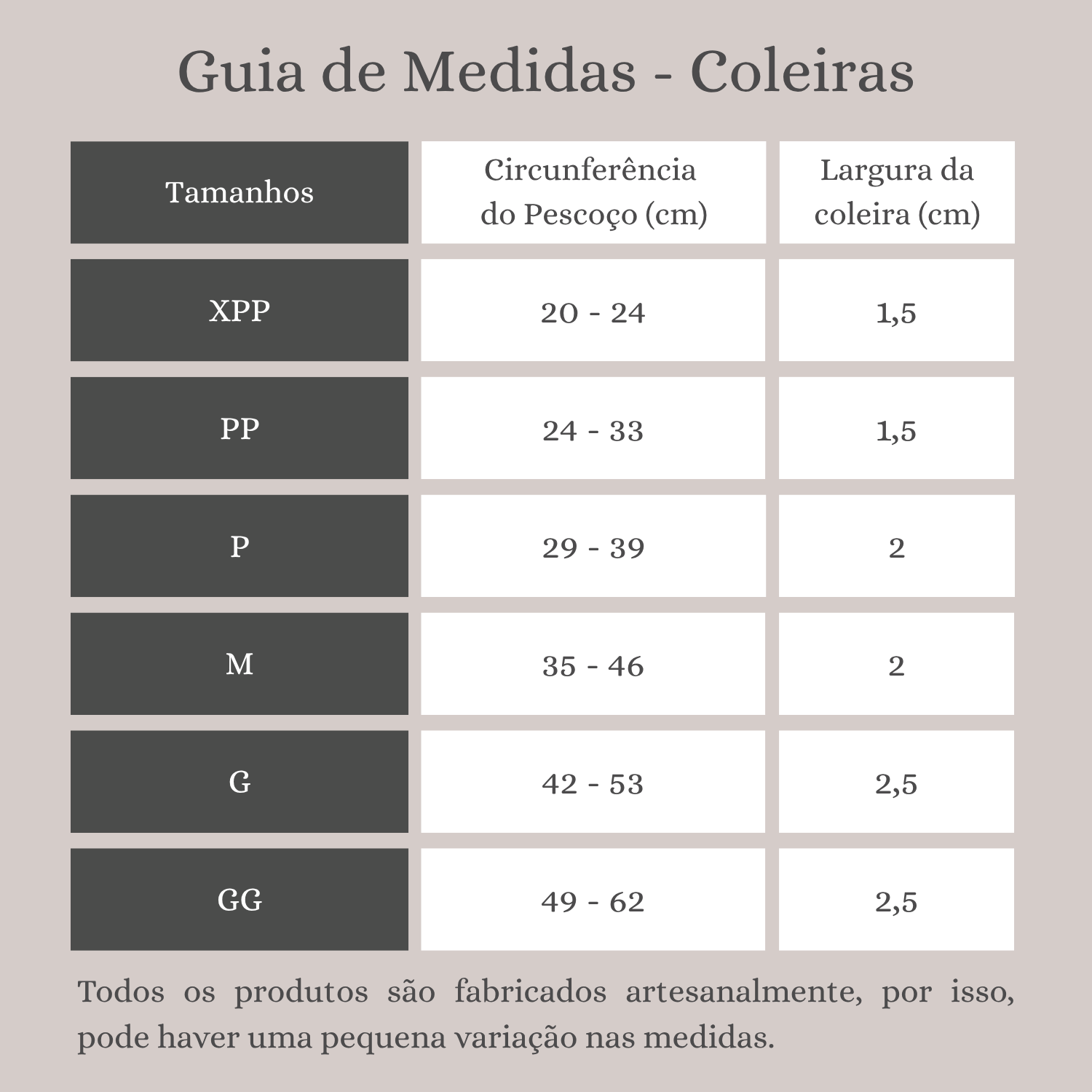 Antes de fazer a sua compra recomendamos medir o pescocinho do pet com uma fita métrica, sendo a medida justa, mas sem apertar, na parte do meio do pescoço onde vai ficar a coleira.